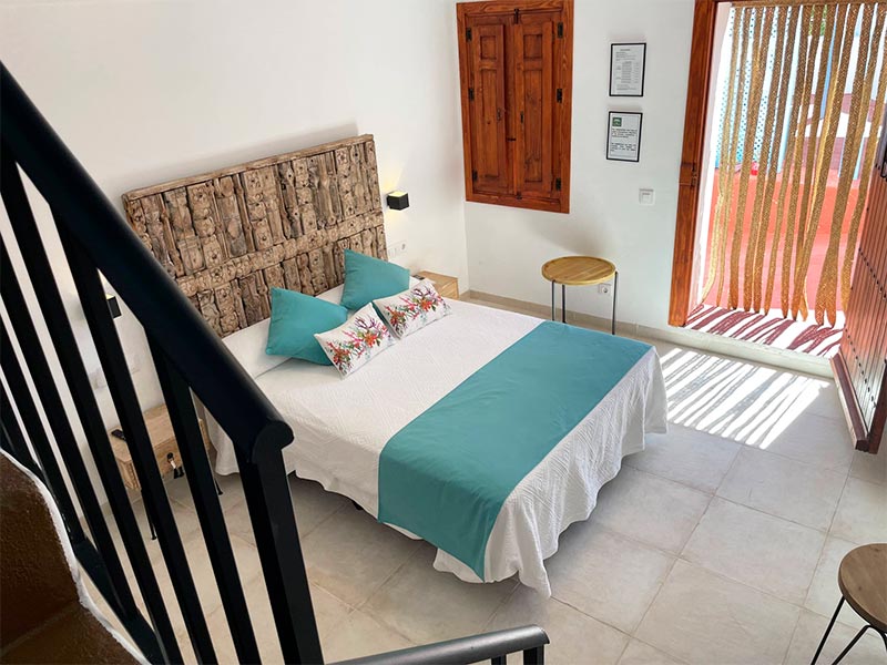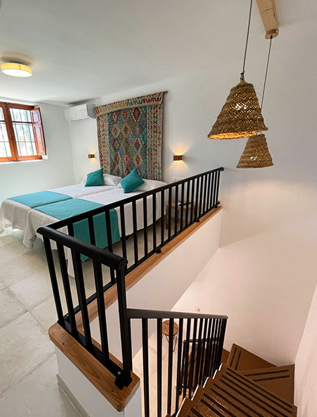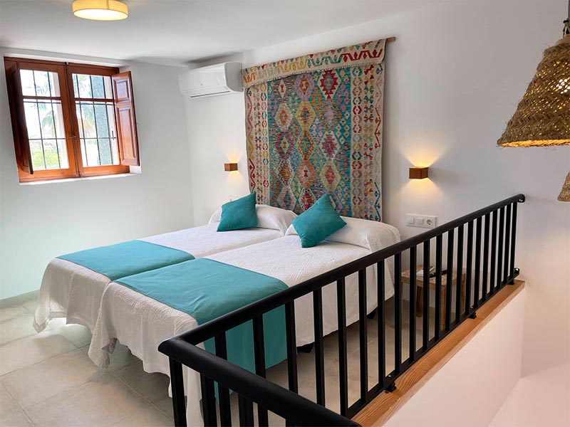 Perfecta para familias, esta habitación se distribuye en dos plantas conectadas por una escalera interior. En la planta baja se encuentra una cama doble y el baño completo, mientras que en la planta alta hay dos camas individuales. Puede alojar cómodamente hasta cuatro personas, con opción de cama supletoria o cuna.